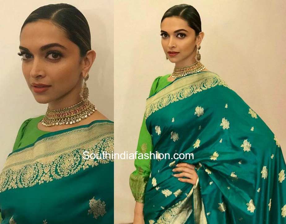 Deepika Padukone Green Saree - Deepika padukone paired a lustrous strapless fuschia blouse embellished with clusters of beads with a bright, neon green saree.